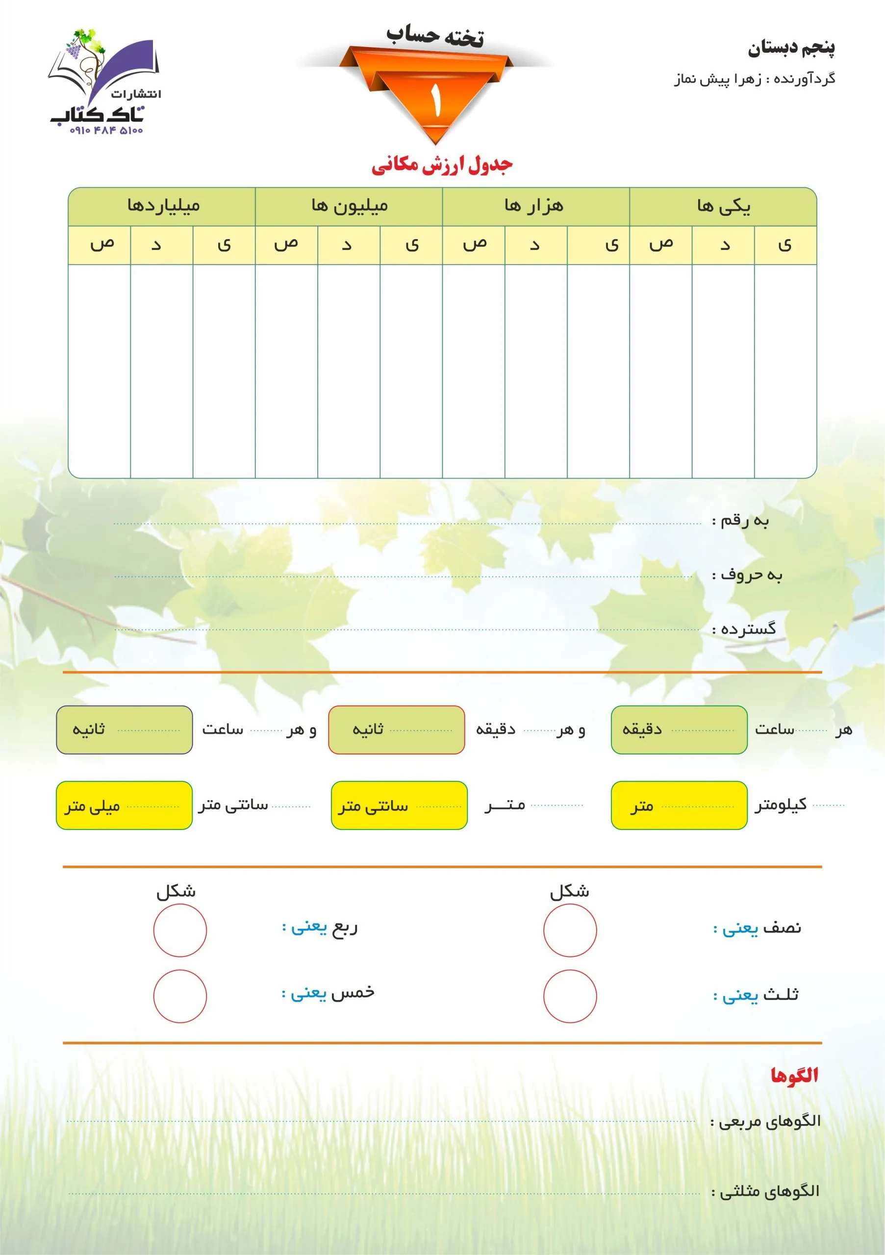 تخته حساب لمینت شده مخصوص کلاس پنجم ابتدایی شماره ۱