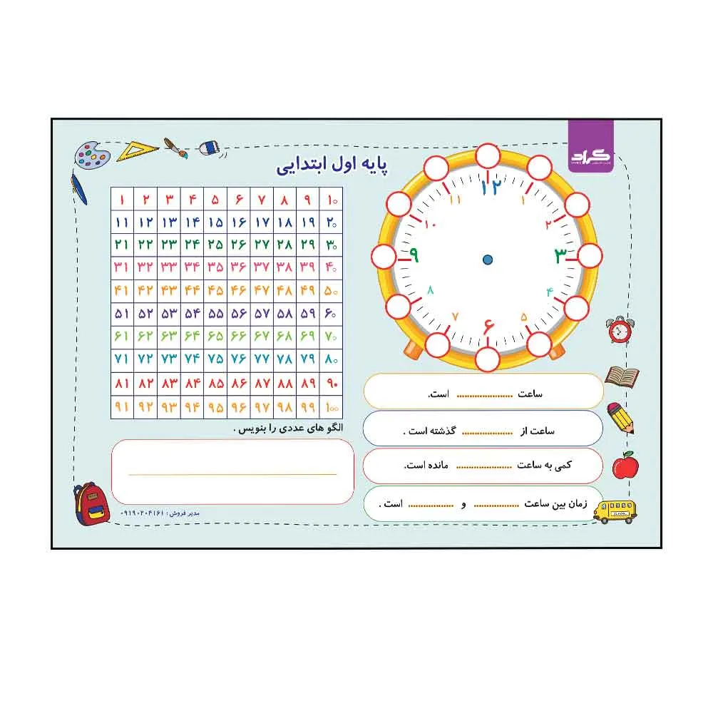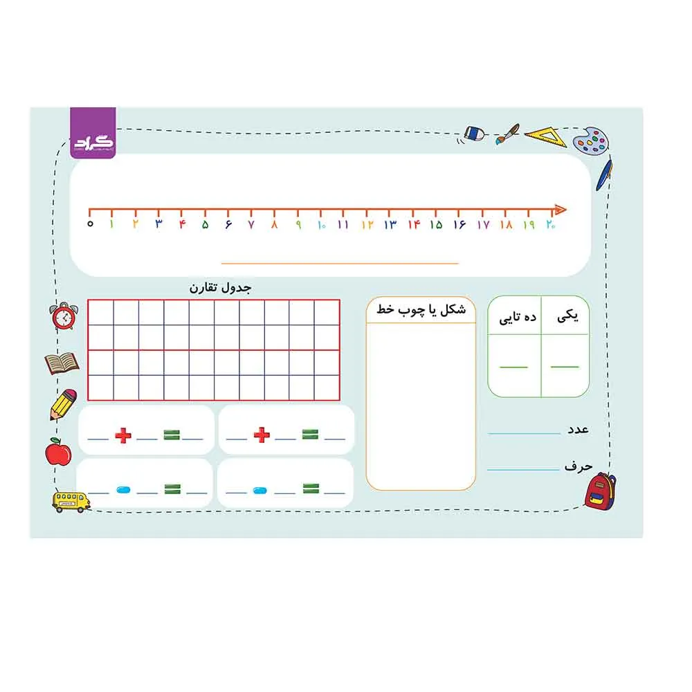 تخته وایت برد دو طرفه انتشارات گراد دارای جداول و الگوهای کاربردی دانش آموزان جمله یک محور اعداد، جدول اعداد 1 تا 100، جدول ارزش مکانی یکی و ده‌تایی، تساوی جمع و تفریق و تصویر یک ساعت بدون عقربه و دارای ارقام ساعت‌شمار و دقیقه ‌شمار برای آموزش ساعت وجود دارد. با استفاده از این تخته، تجربه تمرین ریاضی به یک تجربه شیرین تبدیل می‌شود .