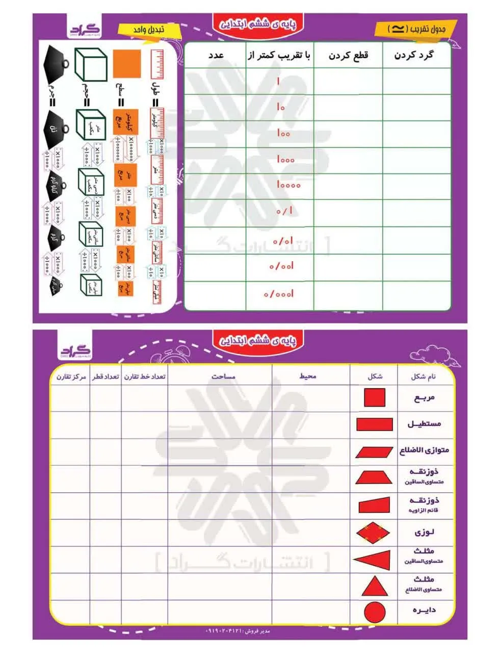 لمینت دو طرفه انتشارات گراد دارای جداول و الگوهای کاربردی از جمله بخش محاسبه حجم و مساحت ، تبدیل کسر و اعداد اعشار ، نمودار ها ، جدول ارزش مکانی  و… است با استفاده از این تخته، تجربه تمرین ریاضی به یک تجربه شیرین تبدیل می‌شود .