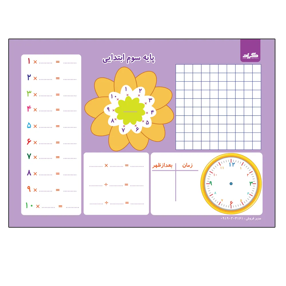 لمینت وایت برد دو طرفه انتشارات گراد دارای جداول و الگوهای کاربردی دانش آموزان جمله یک محور اعداد، جدول اعداد 1 تا 100، جدول ارزش مکانی یکی و ده‌تایی، تساوی جمع و تفریق و تصویر یک ساعت بدون عقربه و دارای ارقام ساعت‌شمار و دقیقه ‌شمار برای آموزش ساعت وجود دارد. با استفاده از این تخته، تجربه تمرین ریاضی به یک تجربه شیرین تبدیل می‌شود .