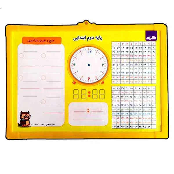 تخته وایت برد دو طرفه انتشارات گراد دارای جداول و الگوهای کاربردی دانش آموزان جمله یک محور اعداد، جدول اعداد 1 تا 100، جدول ارزش مکانی یکی و ده‌تایی، تساوی جمع و تفریق و تصویر یک ساعت بدون عقربه و دارای ارقام ساعت‌شمار و دقیقه ‌شمار برای آموزش ساعت وجود دارد. با استفاده از این تخته، تجربه تمرین ریاضی به یک تجربه شیرین تبدیل می‌شود .